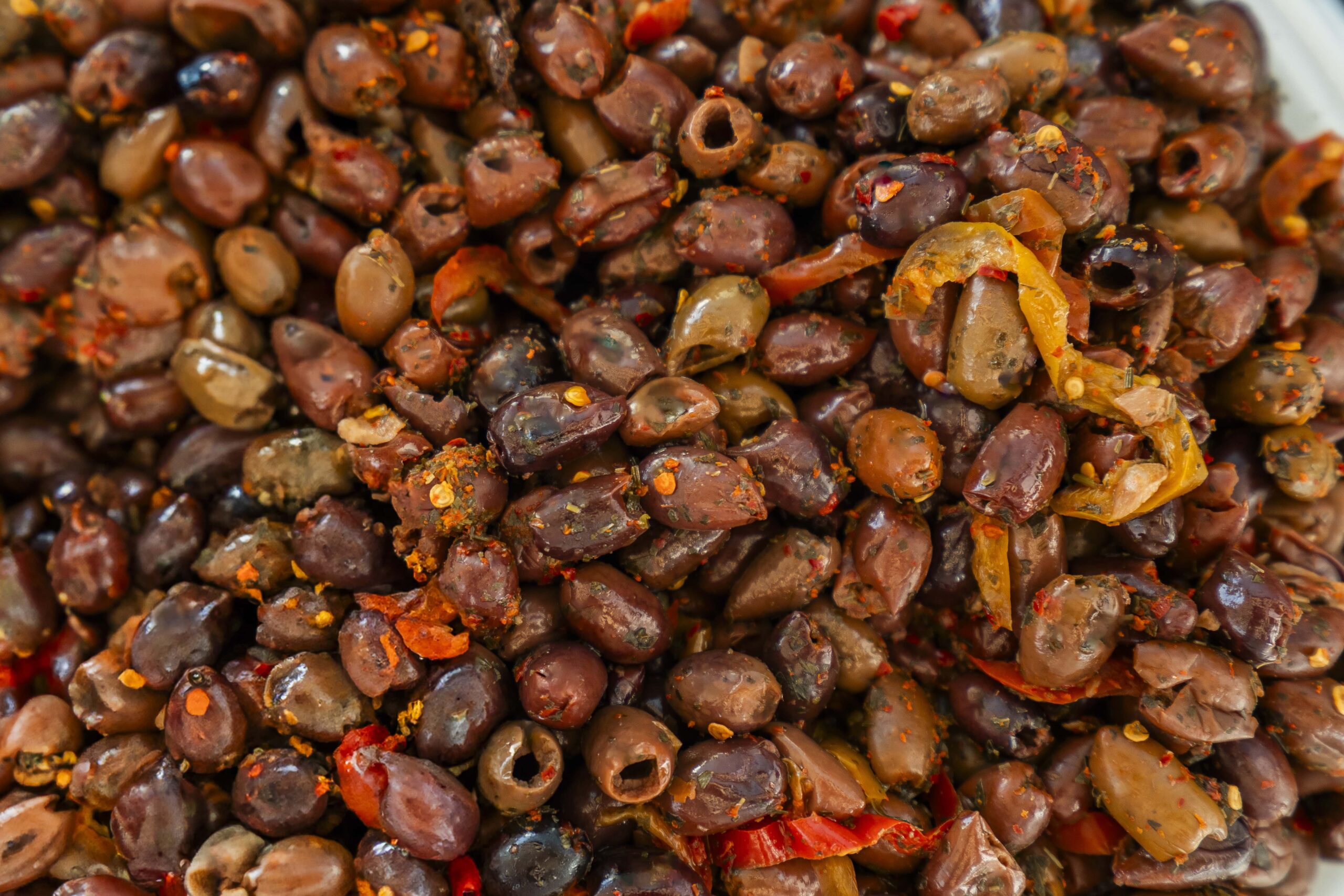 (IT) Olive nere senza nocciolo, insaporite con aromi mediterranei.